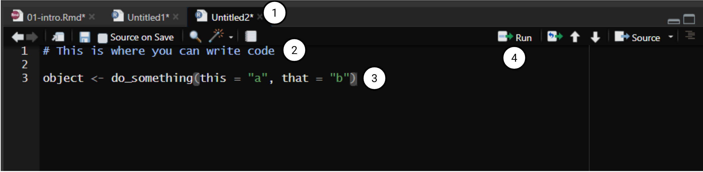 The first pane, and probably the one you will spend the most time in, is the source pane. This is where you can write and edit your scripts, which are your files that contain R code. Generally, you will be working with either .R files (which contain code only) or .rmd files (which are more akin to traditional documents with chunks that execute code).