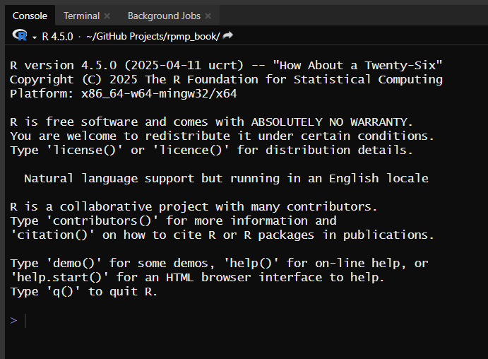 We won’t get too deep into project-oriented workflows for RPMP. However, there are several benefits to working within projects in RStudio, which we will expand on in the coming pages. One benefit that we can discuss now though is that projects simply encourage effective and easy file management: by containing everything within the one folder, you can organise all your files relevant to that project within the one group. It might be useful, for example, to create one Project for each study in your thesis (if your thesis is quantitative and you plan on using R).