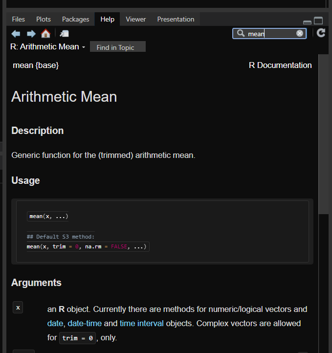 - Help: This pane lets you search for help pages on functions.