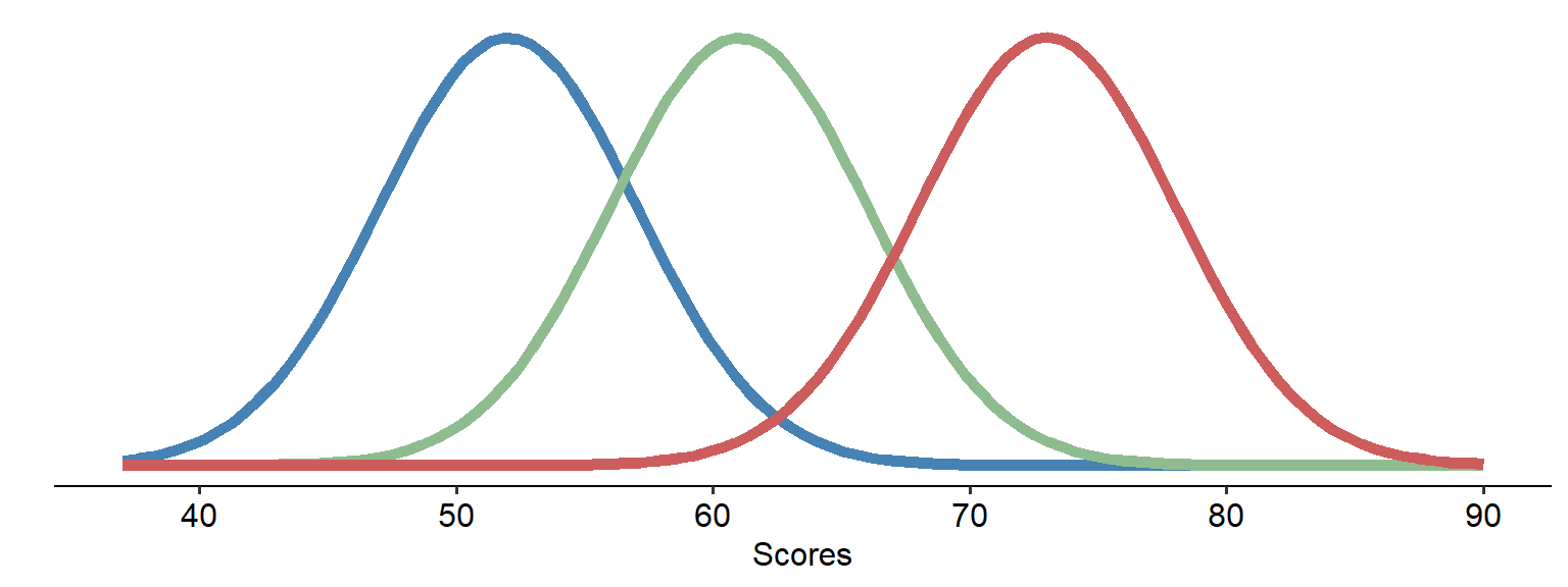 Pretend that the three curves above represent data covering three different groups, and that we’ve hypothesised that there are three different means. Collectively, this data has a certain amount of variance.