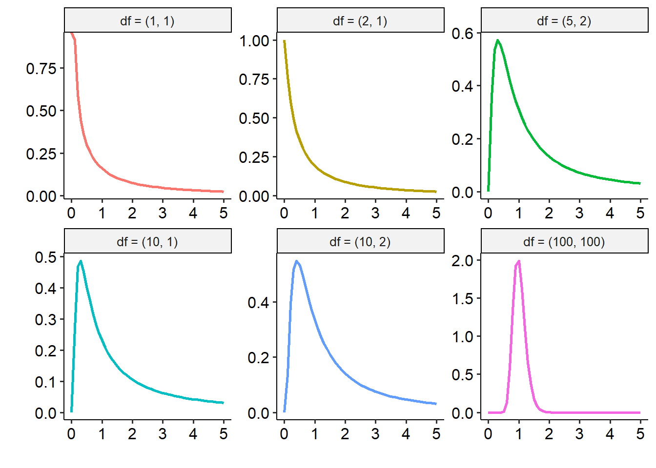 Like the other tests we’ve encountered so far, ANOVAs have their own underlying distribution. In this instance, this is the F distribution, which describes how the F-statistic behaves. We won’t go far into the maths around this, but the key here is that the F distribution is characterised by two sets of degrees of freedom: one that relates to the between-groups variance/effect, and one that relates to the within-groups variance. One thing to note here is the terminology in the headers of each graph: the first number in the brackets refers to the between-groups variance, while the second number refers to the within-groups variance.