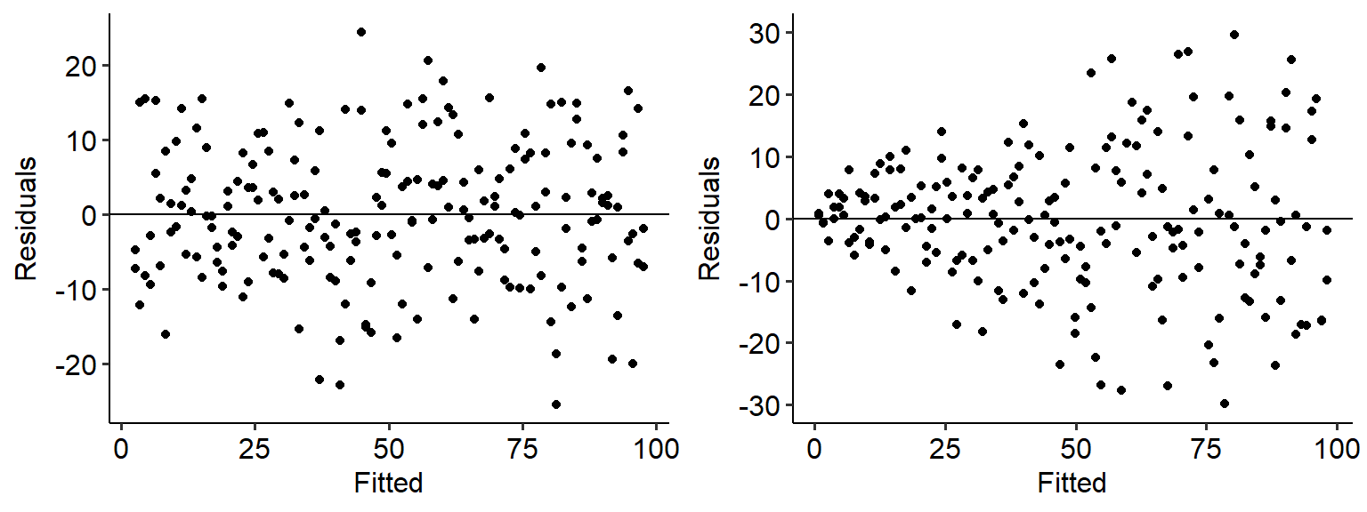 The easiest way to test this is to create a fitted vs residuals graph. As the name implies, we take the fitted values for each level of the predictor in our data, and plot that against the residuals (fitted - actual). Here are some fitted vs residual plots for two sets of data. The data on the left has an even spread of variance as X increases, meaning that it is homoscedastic; the data on the right, on the other hand, spreads out like a cone. The data on the right therefore is likely heteroscedastic.
