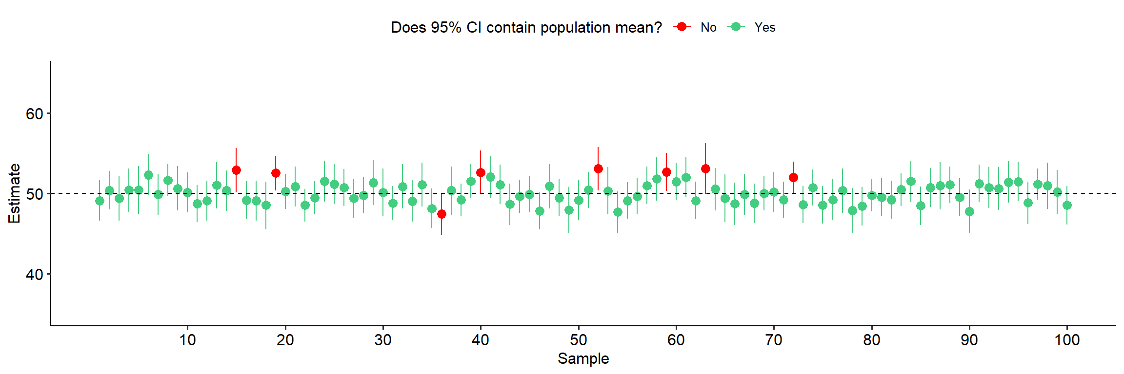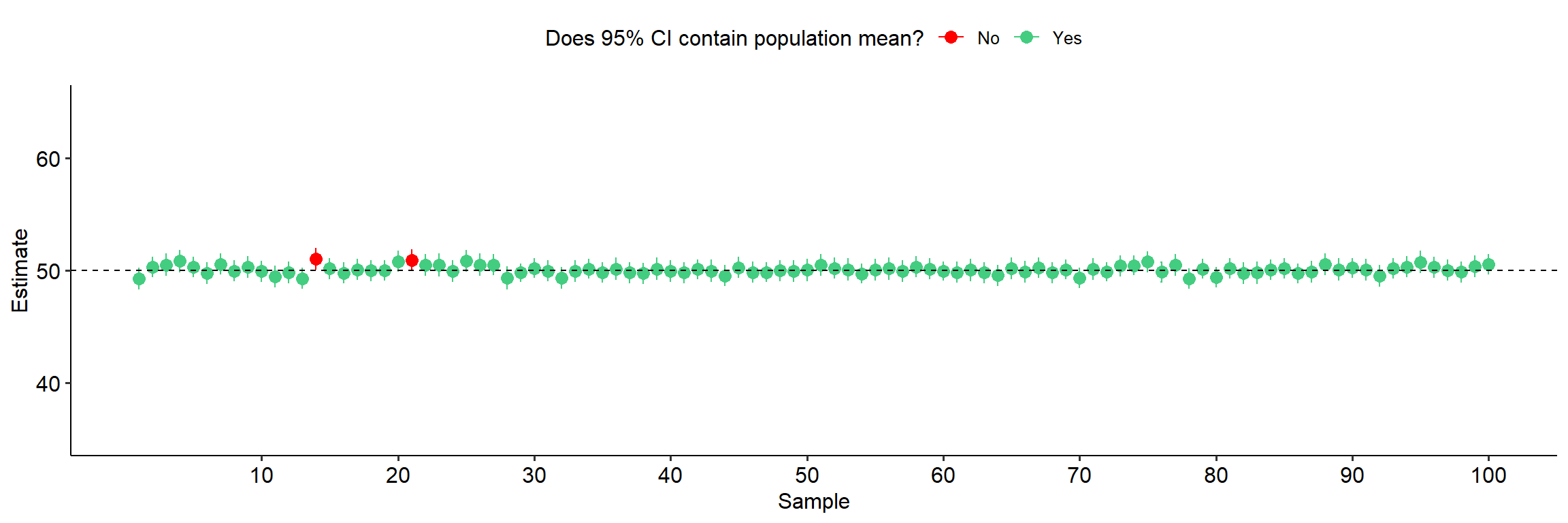 Therefore, if we have an estimate of a population parameter (e.g. what the population mean is), we can use a 95% CI around that estimate to quantify the precision/uncertainty of that estimate. If a confidence interval is narrow, it suggests our estimate is quite precise.
