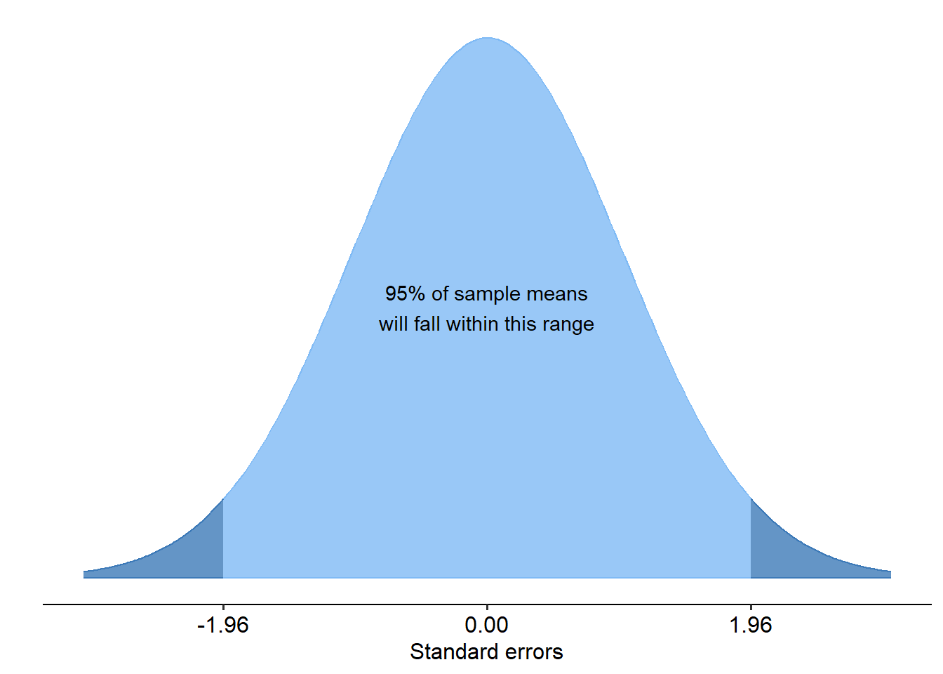 We can use the same principle to make inferences about the true population parameter. When we take a sample, each one will have its own standard error (remember this reflects an estimate of the distance between the sample mean and the true population mean). If we were to repeatedly take samples, in the long run we would expect the true population mean to fall within 95% of all sample means. And, just like the normal distribution, when we look at the sampling distribution of the means below, 95% of all sample means will fall within 1.96 standard errors (thanks to the Central Limit Theorem).