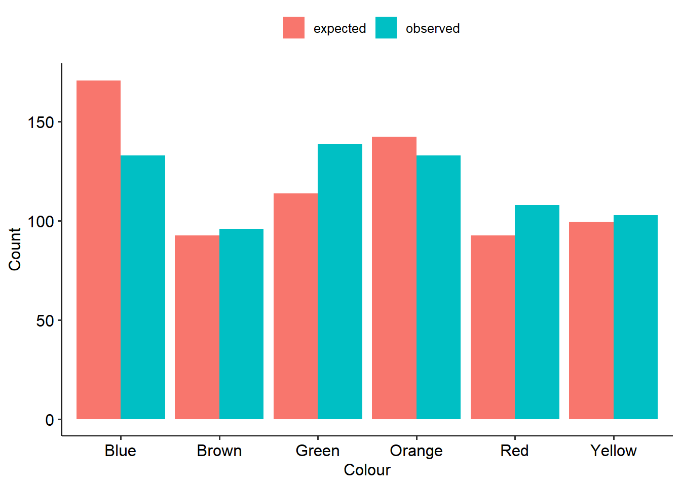- A chi-square goodness of fit will allow us to test whether the distribution of colours in a sample of M&Ms aligns with the published proportions.