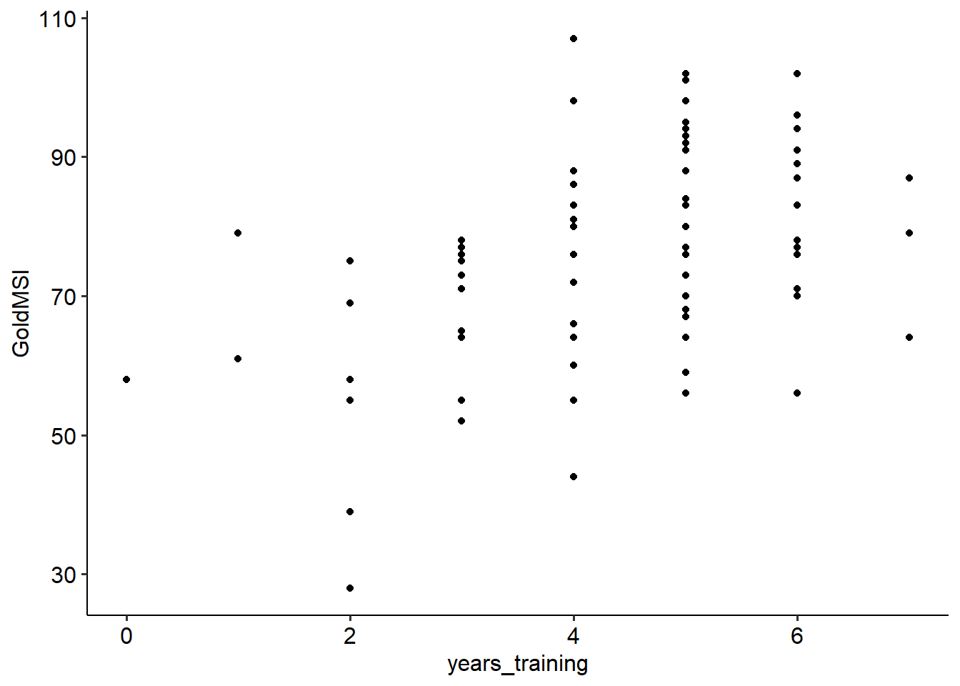 ## lm(formula = GoldMSI ~ years_training, data = w10_goldmsi)