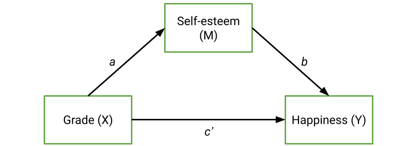 To illustrate the causal steps approach (and subsequent approaches), we will use a fictional dataset below. This dataset contains scores on students’ grades, self-esteem and happiness. We theorise that the relationship between a student’s grades and their happiness is mediated by their self-esteem, which gives rise to the hypothetical mediation below: