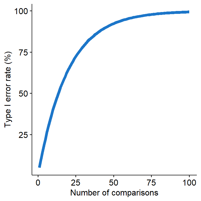 This becomes problematic when we have to conduct multiple tests at once, like what we have to do in an ANOVA. For example, let’s say a variable has 5 levels - A, B, C, D and E. If we ran an ANOVA on this data and found a significant omnibus effect, we would want to find out where that effect is. But that means that we’d have to compare A, B, C, D and E all against each other, in a round-robin tournament way (e.g. A vs B, then A vs C…). Where this becomes an issue is that each comparison will have its own 5% Type I error rate (assuming we use alpha = .05). So in this scenario, the Type I error rate will stack with each new comparison, meaning that our overall Type I error rate will climb higher and higher. This means that the chance of finding a false positive will increase (see graph below).
