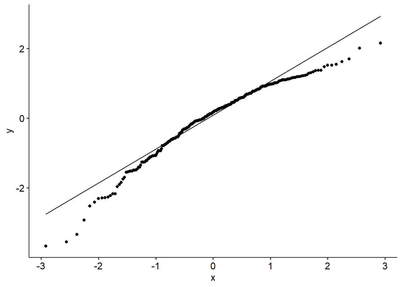 Our usual tests apply here too. Below is a QQ plot, which might suggest that our residuals aren’t normally distributed. (Use the data and perform a SW test on it to see what happens!)