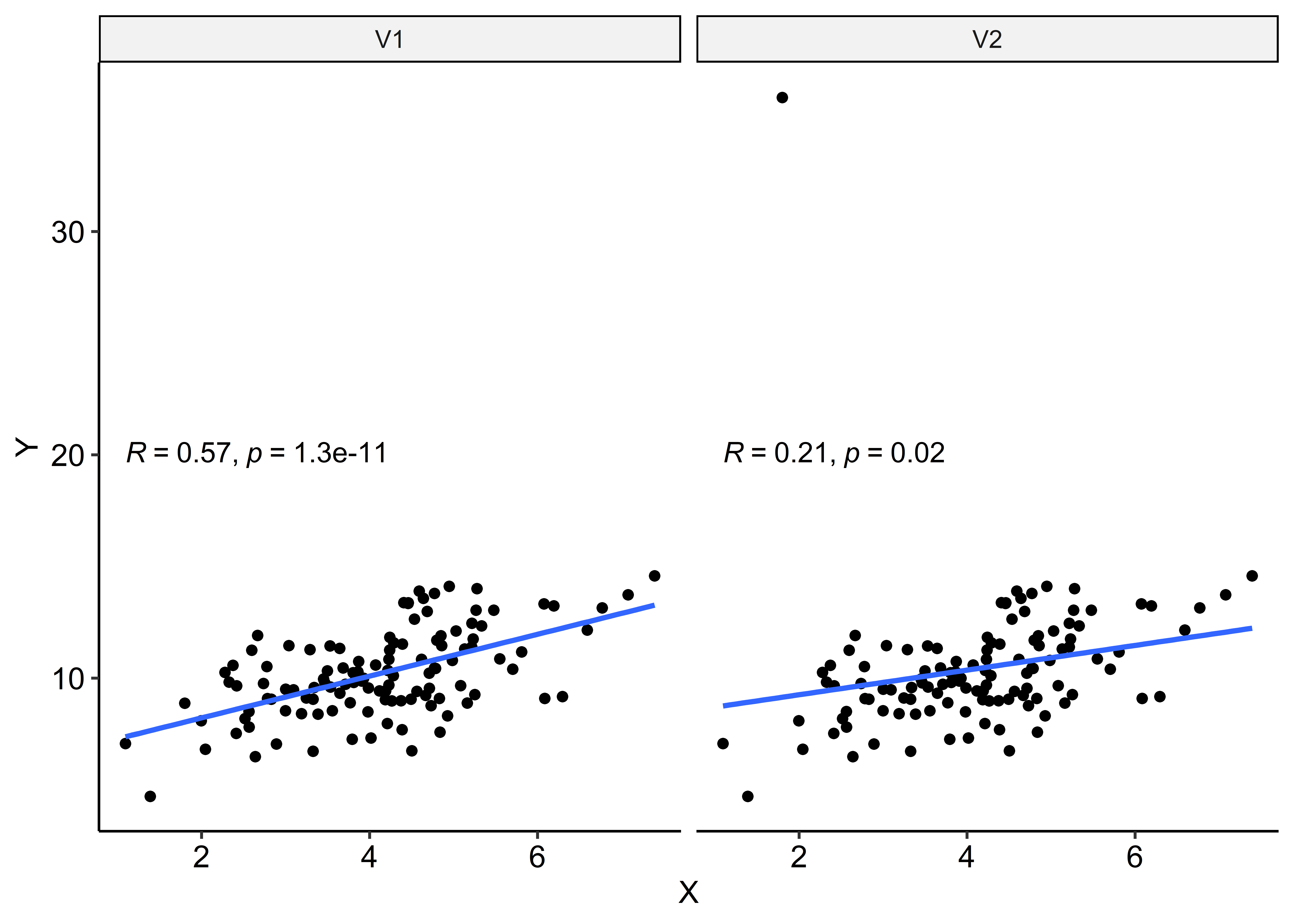 You can see that in the graph on the left, there are no visible outliers, while the graph on the right has a very clear outlier (the dot at the very top). The resulting estimate of the correlation is vastly different - r = .57 without the outlier, vs r = .21 with it included!
