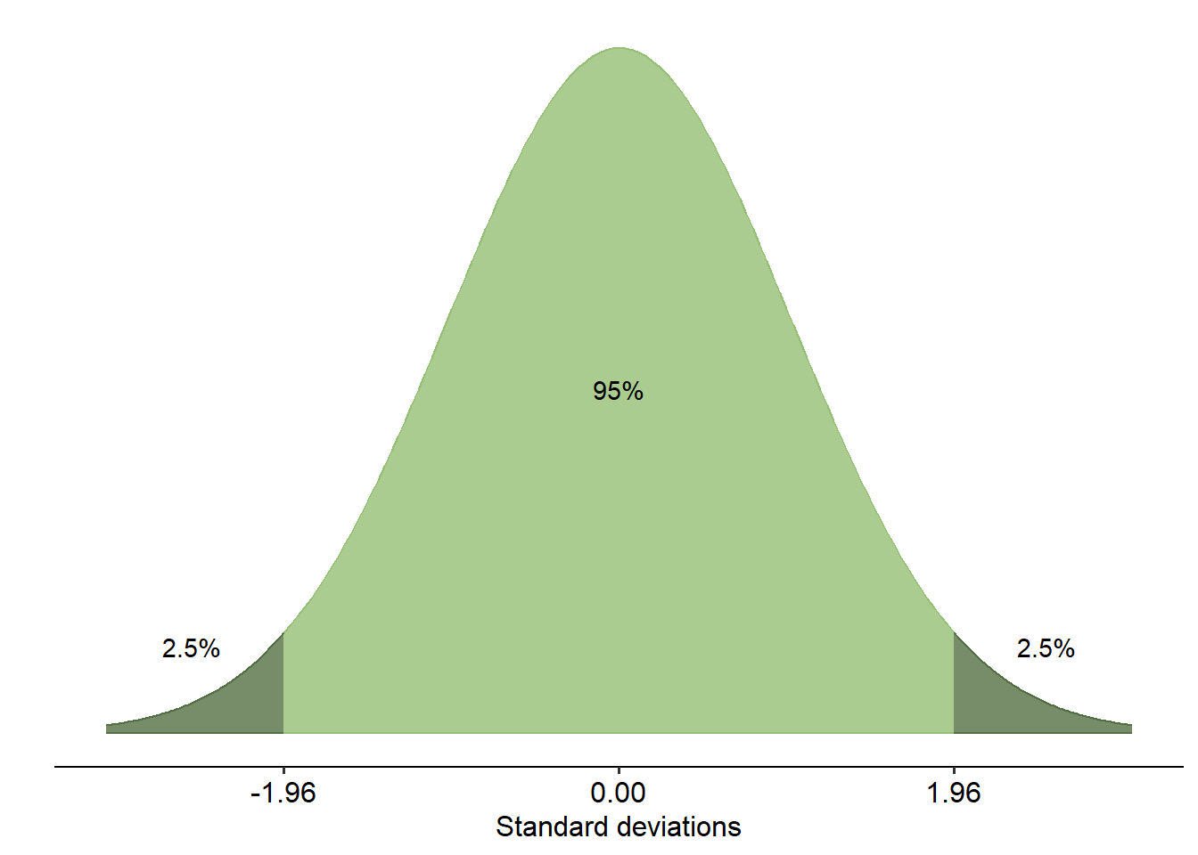 We established last week that on a normal distribution, 95% of the data lies within a certain range of values. Obtaining values beyond these thresholds (1.96 standard deviations either side of the mean) account for a relatively small percentage of possible values. In other words, the probability of getting a value beyond these bounds (in the figure above, where the dark green areas are) is low.