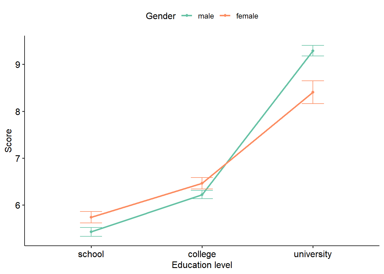 How do we interpret this? Clearly, we have no main effect of gender (p = .448) but we do have an effect of education level (p < .001). We also have a significant interaction term: gender x education (p = .002).