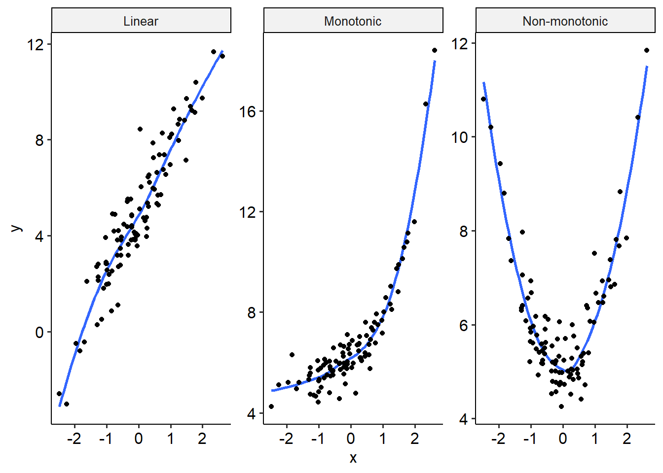 In the linear and monotonic examples, the line of best fit follows one direction - up. In the rightmost graph, however, there is a decrease and then an increase in the predicted values of y. This is an example of a non-monotonic function.