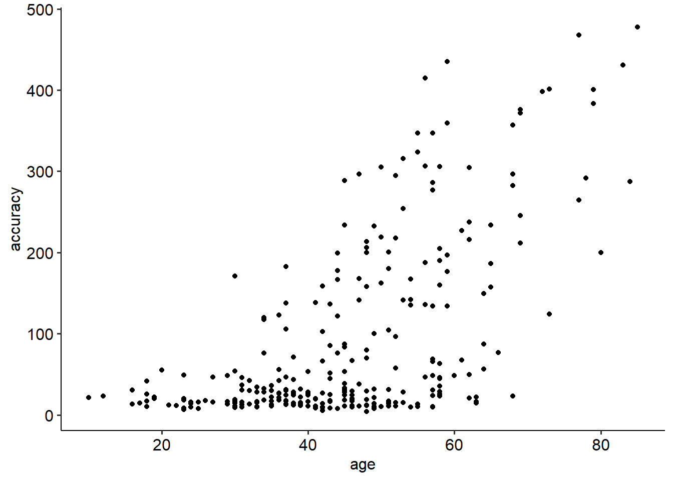 The relevant dataset contains just two variables: accuracy (measured in cents) and age (participant age). The scatterplot below shows the relationship between these two variables: