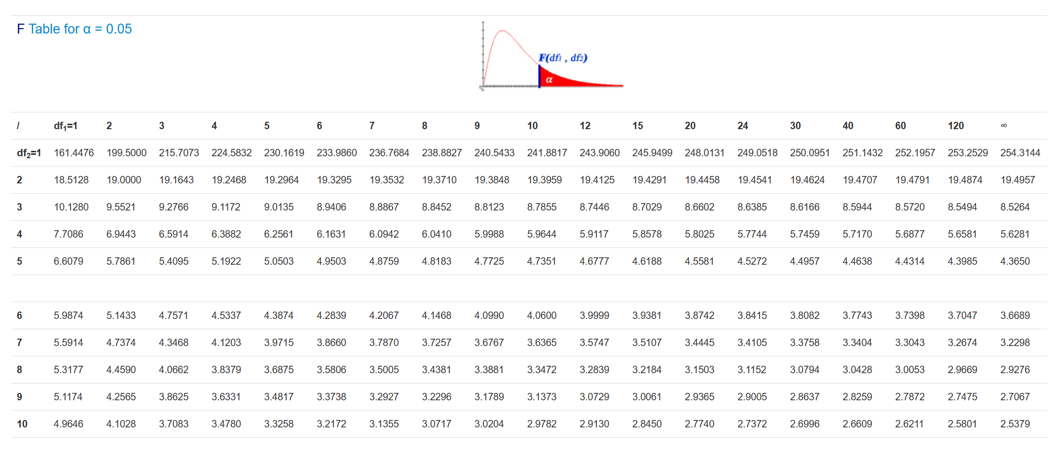 Reading the column for df1 = 2, and the row for df2 = 9, we get a critical F-statistic of 4.2565. Now we can say that because our observed test statistic (15.75) is greater than this critical value, our ANOVA is significant at the alpha = .05 level.