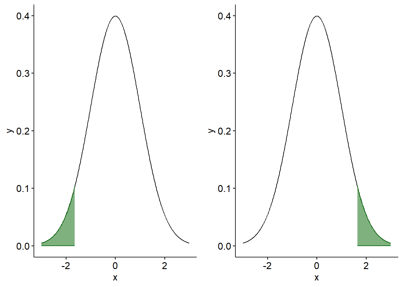 The two curves below show the significance levels for one-tailed hypotheses. If we predicted that Group A was smaller than Group B, we would only reject the null hypothesis if Group A really was smaller than Group B, and this difference was large enough to be statistically significant (i.e. within one of the green tails).