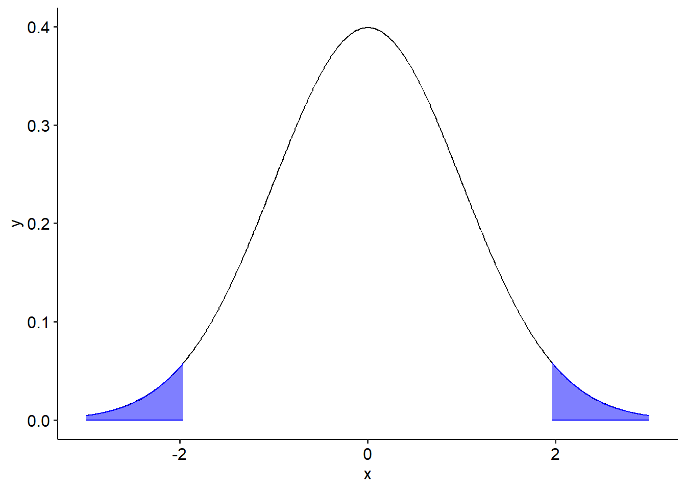 The blue areas on the curve on the right represent a 0.05 level of signifiance for a two-tailed hypothesis test. This is essentially how likely it is that we would observe our effect/difference if nothing was happening. If a difference is large enough that it falls within these blue tails, it is statistically significant. This is because if nothing really was happening, it would be unlikely that we see an effect/difference this big. Therefore, we would choose to reject the null hypothesis at this would fall below our chosen significance level.