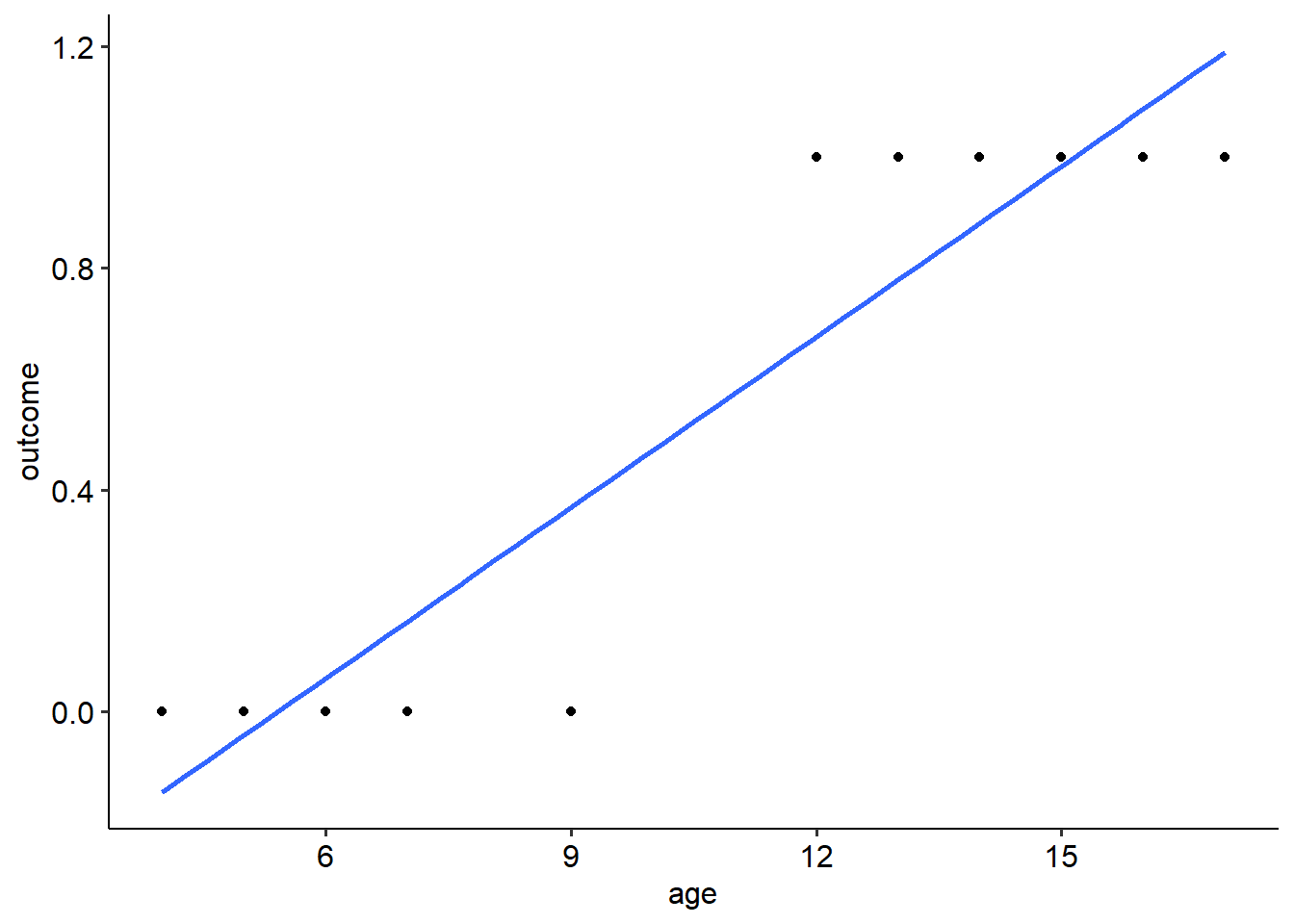 Consider the following example data. We can see that we have two columns of interest: age and outcome. Notice how outcome only takes the values of 0 and 1. This is because this is a binary variable, where 0 = one outcome and 1 = another outcome. Often, we run into situations where we are interested in predicting a binary outcome using a series of predictors, including continuous ones.