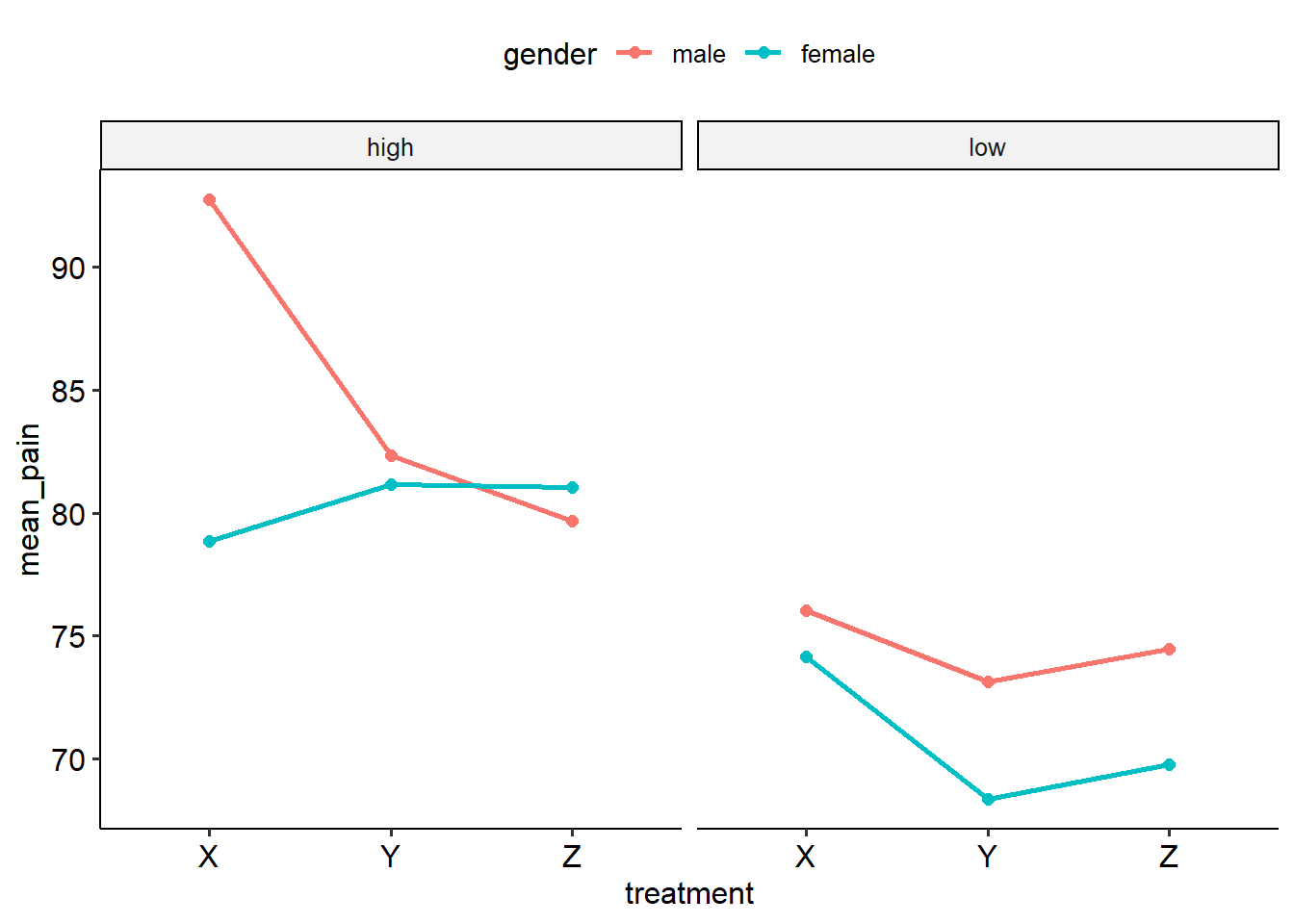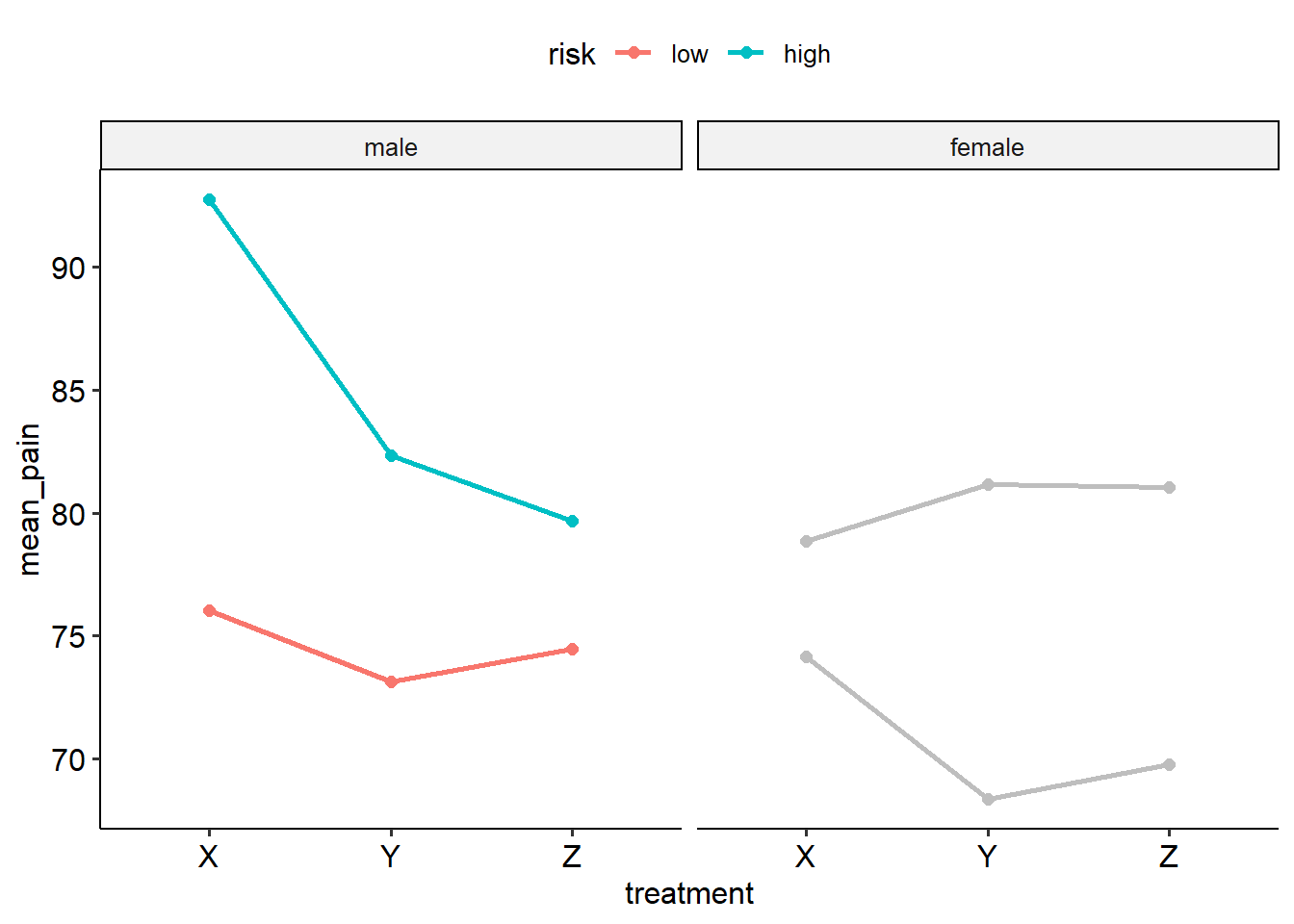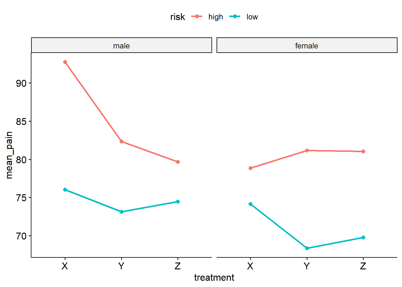Let’s start by visualising this data. We cannot fully visualise a three-way interaction because we inherently need four dimensions (as we have three predictors and one outcome variable). The best way to approach this is to draw a series of two-way interaction plots, split by the third variable. In the example below, the graphs show treatment on the x-axis, pain scores on the y-axis, different lines for low and high risk and separate graphs for male and female participants: