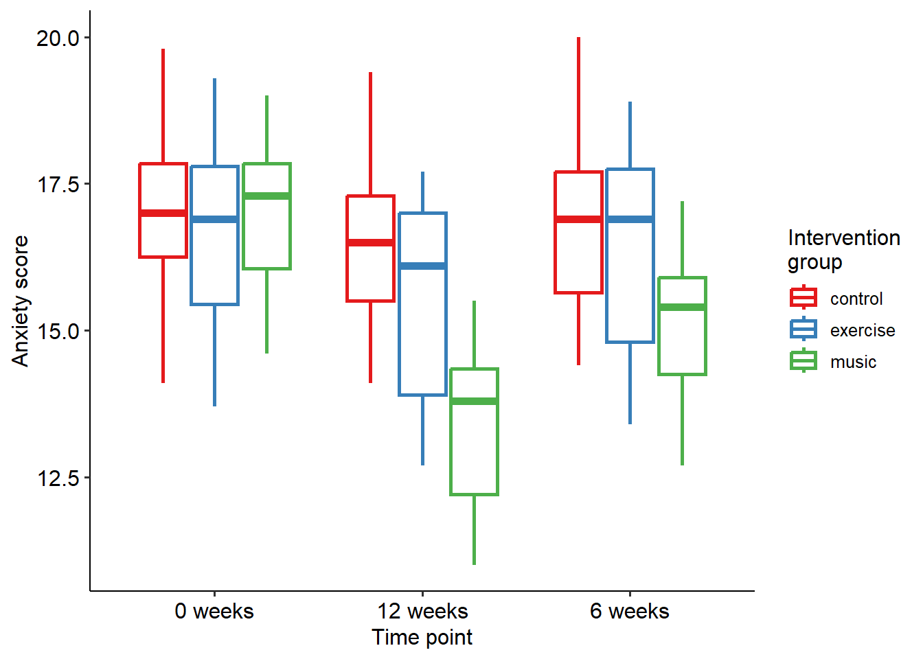 Elaine and Chaise ran an RCT testing the effect of a music listening intervention on anxiety scores. To do this, participants were randomly allocated to three conditions: a music listening intervention (listen to a podcast for 30 minutes a day), a control exercise intervention (walk for 30 minutes a day) and a control nothing intervention (do nothing). Participants were tested at three timepoints: at the start of the study, at the 6 week mark and then at the 12 week mark. (With thanks to the datarium package for providing a perfect test dataset for this example.)